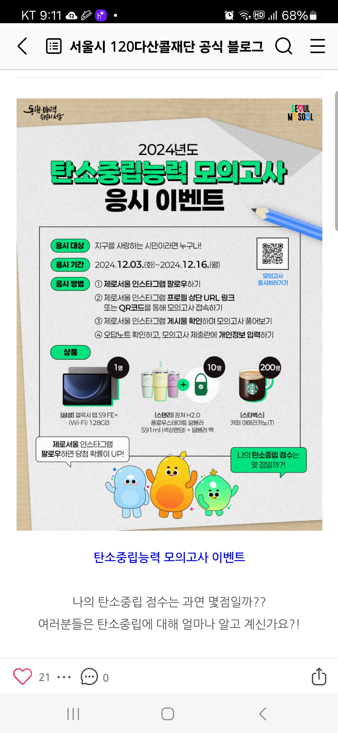 서울시 120다산콜재단 탄소중립능력 모의고사 응시 이벤트 (~12.16) 작성자난이언니|작성시간24.12.08|조회수224 목록 댓글 3 글자크기 작게가 글자크기 크게가 https://m.blog.naver.com/120seoulcall/223683326105 다음검색 현재 게시글 추가 기능 열기 북마크 공유하기 신고 센터로 신고 댓글 댓글 3 댓글쓰기 답글쓰기 댓글 리스트 작성자팥빙수좋아라 | 작성시간 24.12.08 감사합니다 작성자네오베르베르 | 작성시간 24.12.10 감사합니다 작성자광어 | 작성시간 24.12.11 정보 감사합니다. 댓글 전체보기