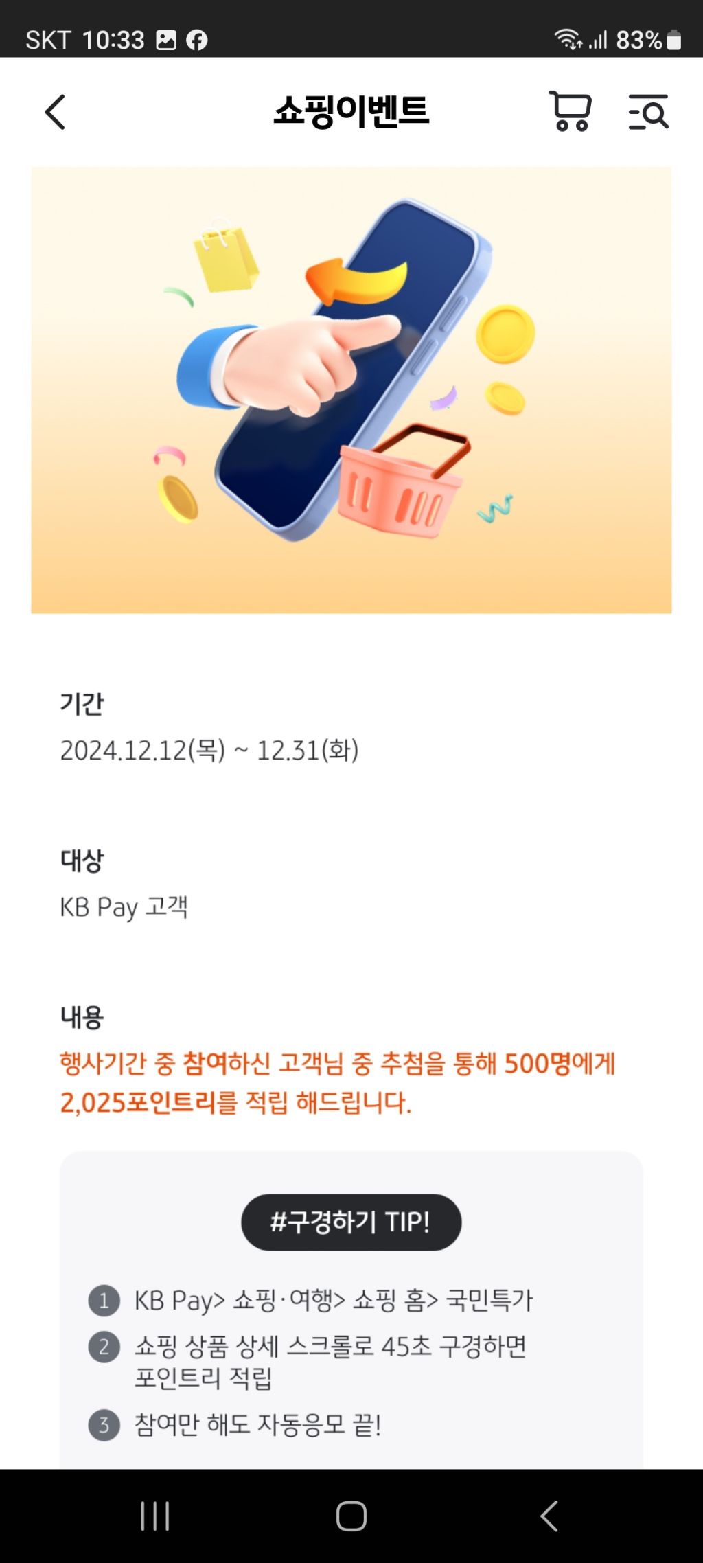 kbpay 쇼핑 구경하고 포인트리 받자(~12.31) 작성자나도쫌|작성시간24.12.15|조회수193 목록 댓글 1 글자크기 작게가 글자크기 크게가 제목없음여기를 눌러 링크를 확인하세요kbpay-life.kbcard.com 다음검색 현재 게시글 추가 기능 열기 북마크 공유하기 신고 센터로 신고 댓글 댓글 1 댓글쓰기 답글쓰기 댓글 리스트 작성자star | 작성시간 24.12.15 2p ㅠㅠ 댓글 전체보기