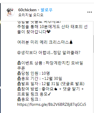60계치킨 짜장계란치킨은 몇 번 보따리에 있을까요? ~12.30 작성자야콩|작성시간24.12.29|조회수155 목록 댓글 2 글자크기 작게가 글자크기 크게가 https://www.instagram.com/p/DD8XCALgUOJ/?hl=ko 다음검색 현재 게시글 추가 기능 열기 북마크 공유하기 신고 센터로 신고 댓글 댓글 2 댓글쓰기 답글쓰기 댓글 리스트 작성자Garlic05 | 작성시간 24.12.29 감사합니다. 작성자네오베르베르 | 작성시간 24.12.30 감사합니다 댓글 전체보기