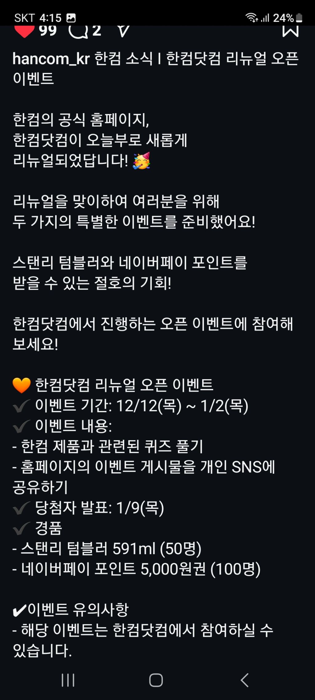 한컴 닷컴 리뉴얼 오픈 이벤트 (~1.2) 작성자나도쫌|작성시간25.01.02|조회수201 목록 댓글 0 글자크기 작게가 글자크기 크게가 https://www.instagram.com/p/DDdz6n8Ok0r/?img_index=2&igsh=MTMzc3JqcGVqZWMxYQ== 다음검색 현재 게시글 추가 기능 열기 북마크 공유하기 신고 센터로 신고 댓글 댓글 0 댓글쓰기 답글쓰기 댓글 리스트
