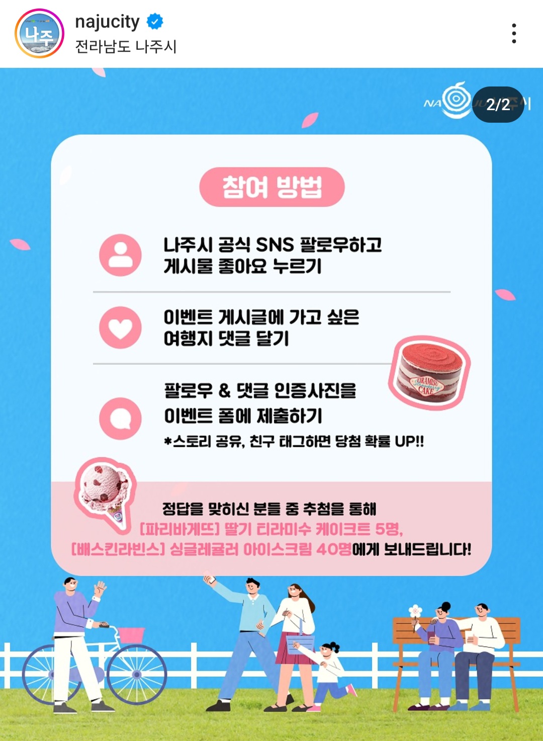 나주시 봄나들이 명소 추천 이벤트 (~3.18) 작성자난이언니|작성시간25.02.28|조회수192 목록 댓글 3 글자크기 작게가 글자크기 크게가 https://www.instagram.com/p/DGkKrY1y0_m/?img_index=1&igsh=YnI1aWZvbjN0aWNi 다음검색 현재 게시글 추가 기능 열기 북마크 공유하기 신고 센터로 신고 댓글 댓글 3 댓글쓰기 답글쓰기 댓글 리스트 작성자Garlic05 | 작성시간 25.02.28 감사합니다. 작성자네오베르베르 | 작성시간 25.02.28 감사합니다 작성자아오이유우 | 작성시간 25.03.18 감사합니다 댓글 전체보기