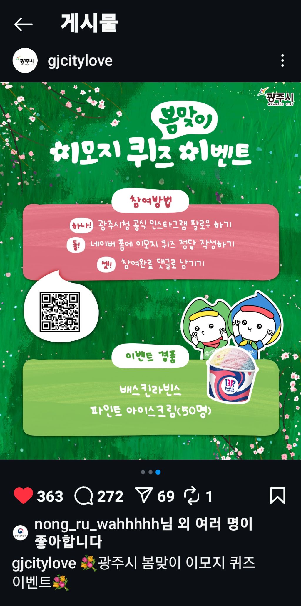 광주시 봄맞이 이모지 퀴즈이벤트 (~4.20) 작성자나도쫌|작성시간25.04.12|조회수168 목록 댓글 2 글자크기 작게가 글자크기 크게가 https://www.instagram.com/p/DISaKcLtHQJ/?img_index=2&igsh=aHM5MWpjcTdkZG1r 다음검색 현재 게시글 추가 기능 열기 북마크 공유하기 신고 센터로 신고 댓글 댓글 2 댓글쓰기 답글쓰기 댓글 리스트 작성자Garlic05 | 작성시간 25.04.12 감사합니다. 작성자네오베르베르 | 작성시간 25.04.13 감사합니다 댓글 전체보기