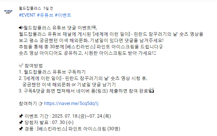 월드잡플러스 유튜브 댓글 이벤트 ~7.24 작성자야콩|작성시간25.07.24|조회수115 목록 댓글 0 글자크기 작게가 글자크기 크게가 https://www.youtube.com/post/Ugkx-8-ELjmHK2_qgjjpm5RJE_RMcbH2TsBW월드잡플러스님의 게시물#EVENT #유튜브 #이벤트 📢월드잡플러스 유튜브 댓글 이벤트!🎉 월드잡플러스 유튜브 채널에 게시된 '[세계에 이런 일이] - 핀란드 잠꾸러기의 날' 숏츠 영상을 보고 평소 궁금했던 이색 해외문화www.youtube.com 다음검색 현재 게시글 추가 기능 열기 북마크 공유하기 신고 센터로 신고 댓글 댓글 0 댓글쓰기 답글쓰기 댓글 리스트