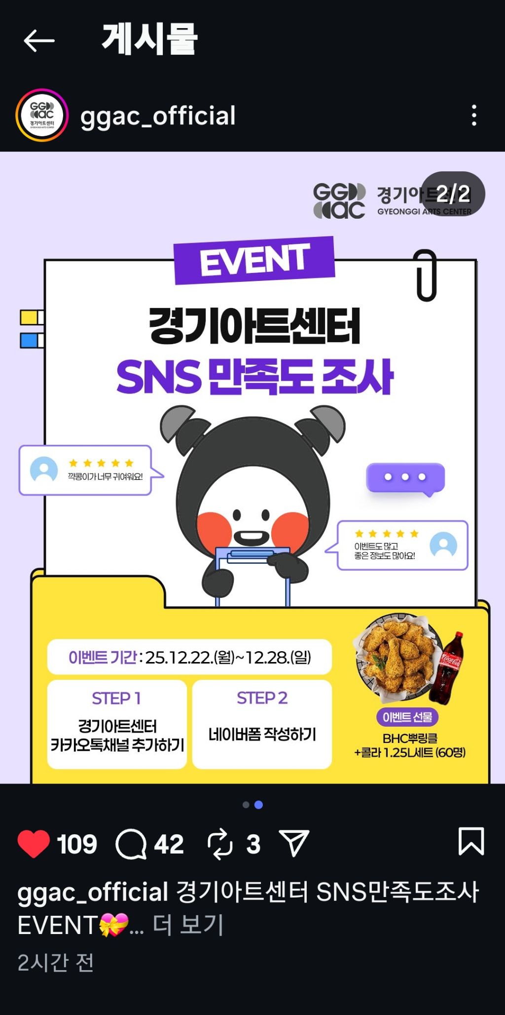 경기아트센터 만족도조사 (~12.28) 작성자나도쫌|작성시간25.12.22|조회수144 목록 댓글 4 글자크기 작게가 글자크기 크게가 https://www.instagram.com/p/DSjZ-HJj-hR/?img_index=1&igsh=MWVmOWZmYTlua3UxdQ== 다음검색 현재 게시글 추가 기능 열기 북마크 공유하기 신고 센터로 신고 댓글 댓글 4 댓글쓰기 답글쓰기 댓글 리스트 작성자네오베르베르 | 작성시간 25.12.22 감사합니다 작성자Garlic05 | 작성시간 25.12.23 감사합니다. 작성자아오이유우 | 작성시간 25.12.25 감사합니다 작성자노아당 | 작성시간 25.12.26 new 감사합니다! 댓글 전체보기