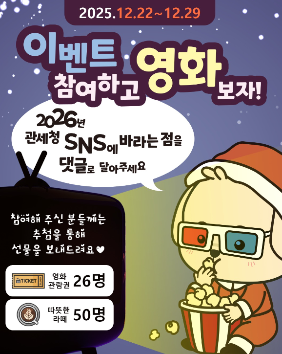 관세청 SNS에 바라는 점 댓글 이벤트 ~12.29 작성자야콩|작성시간25.12.23|조회수157 목록 댓글 2 글자크기 작게가 글자크기 크게가 https://www.instagram.com/p/DSjV6KXj5Gk/ 다음검색 현재 게시글 추가 기능 열기 북마크 공유하기 신고 센터로 신고 댓글 댓글 2 댓글쓰기 답글쓰기 댓글 리스트 작성자네오베르베르 | 작성시간 25.12.23 감사합니다 작성자노아당 | 작성시간 25.12.26 new 감사합니다 댓글 전체보기