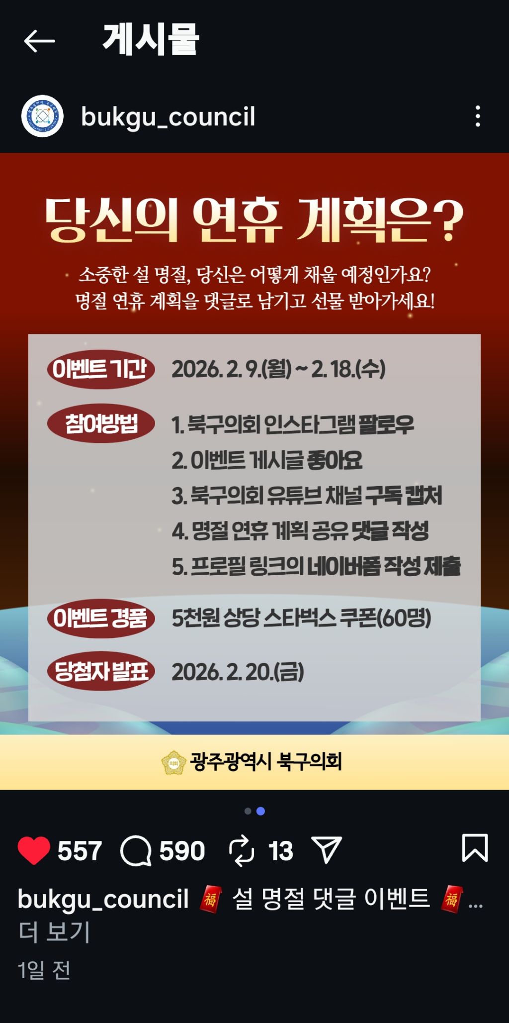 광주북구의회 당신의 연휴 계획은?(~2.18) 작성자나도쫌|작성시간26.02.10|조회수77 목록 댓글 2 글자크기 작게가 글자크기 크게가 https://www.instagram.com/p/DUhJC70kglJ/?img_index=1&igsh=a2M3OWlnd2pkb2du 다음검색 현재 게시글 추가 기능 열기 북마크 공유하기 신고 센터로 신고 댓글 댓글 2 댓글쓰기 답글쓰기 댓글 리스트 작성자네오베르베르 | 작성시간 26.02.10 감사합니다 작성자Garlic05 | 작성시간 26.02.10 감사합니다. 댓글 전체보기