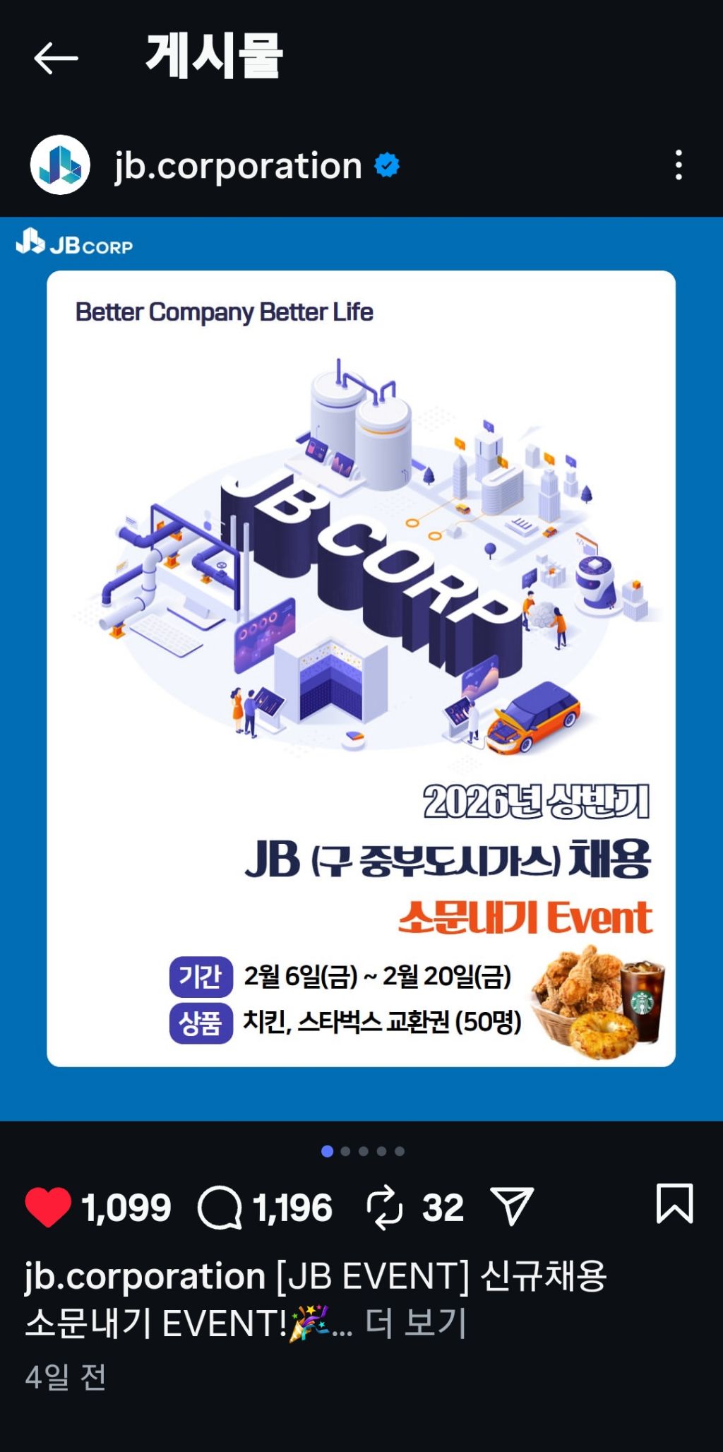 JB 소문내기이벤트 (~2.20) 작성자나도쫌|작성시간26.02.10|조회수72 목록 댓글 2 글자크기 작게가 글자크기 크게가 https://www.instagram.com/p/DUZh_9lEoXd/?igsh=MWE4c2l3Y2Z5MzZ4Nw== 다음검색 현재 게시글 추가 기능 열기 북마크 공유하기 신고 센터로 신고 댓글 댓글 2 댓글쓰기 답글쓰기 댓글 리스트 작성자네오베르베르 | 작성시간 26.02.10 감사합니다 작성자Garlic05 | 작성시간 26.02.10 감사합니다. 댓글 전체보기