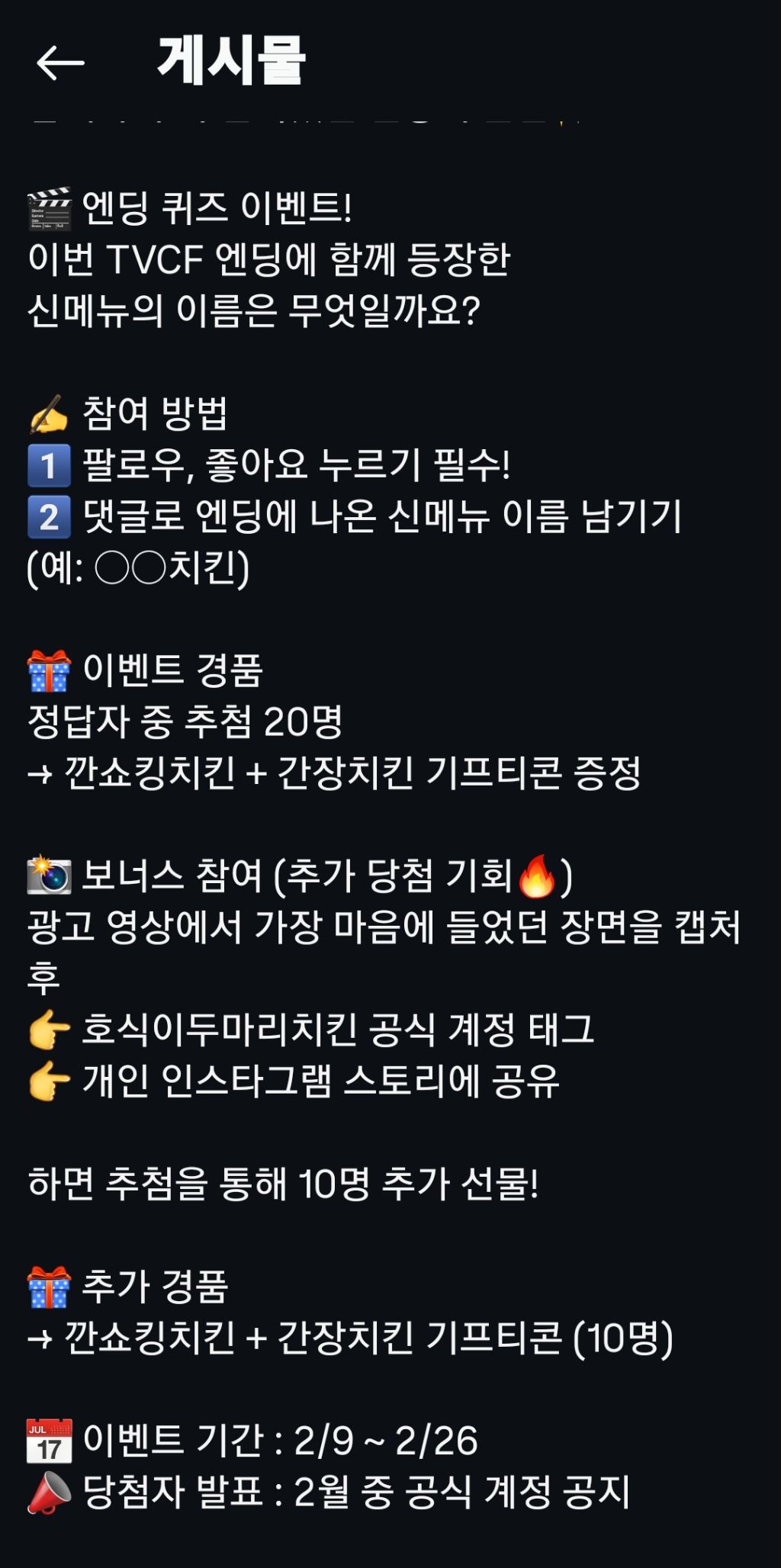 호식이 두마리 치킨 엔딩 퀴즈 이벤트 (~2.26) 작성자나도쫌|작성시간26.02.10|조회수98 목록 댓글 2 글자크기 작게가 글자크기 크게가 https://www.instagram.com/p/DUhC8sPEjeE/?igsh=dnd3cDBkejQ3amh2 다음검색 현재 게시글 추가 기능 열기 북마크 공유하기 신고 센터로 신고 댓글 댓글 2 댓글쓰기 답글쓰기 댓글 리스트 작성자네오베르베르 | 작성시간 26.02.10 감사합니다 작성자Garlic05 | 작성시간 26.02.10 감사합니다. 댓글 전체보기