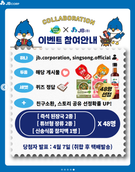 JB 콜라보레이션 이벤트 ~4.5 작성자야콩|작성시간26.03.23|조회수101 목록 댓글 2 글자크기 작게가 글자크기 크게가 https://www.instagram.com/p/DWNJELNkweB/?img_index=5Instagram의 JB님 : "[JB EVENT] 콜라보레이션 이벤트🎉 안녕하세요. 당신의 일상에 가치를 더하는 JB입464 likes, 462 comments - jb.corporation - March 22, 2026: "[JB EVENT] 콜라보레이션 이벤트🎉 안녕하세요. 당신의 일상에 가치를 더하는 JB입니다😊 도시가스 회사 JB㈜와 고객사인 '신송식품'이 다시 만나 함www.instagram.com 다음검색 현재 게시글 추가 기능 열기 북마크 공유하기 신고 센터로 신고 댓글 댓글 2 댓글쓰기 답글쓰기 댓글 리스트 작성자네오베르베르 | 작성시간 26.03.23 감사합니다 작성자아오이유우 | 작성시간 26.04.03 감사합니다 댓글 전체보기