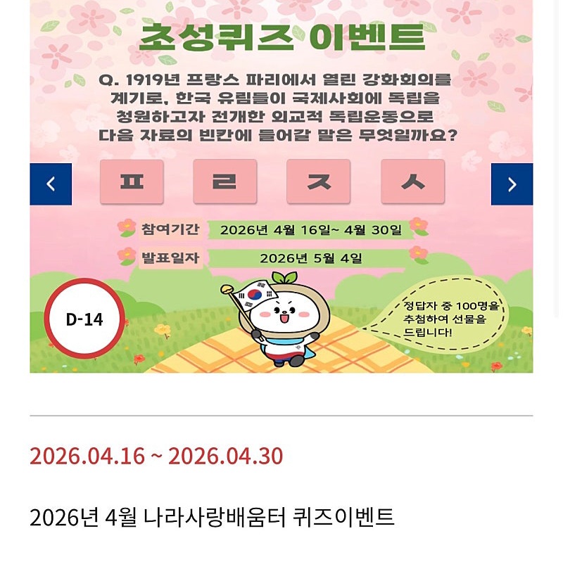 나라사랑배움터 퀴즈이벤트 (~4.30) 작성자나도쫌|작성시간26.04.28|조회수52 목록 댓글 0 글자크기 작게가 글자크기 크게가 나라사랑배움터 - 소통과 참여 > 보훈 이벤트 edu.mpva.go.kr:443 다음검색 현재 게시글 추가 기능 열기 북마크 공유하기 신고 센터로 신고 댓글 댓글 0 댓글쓰기 답글쓰기 댓글 리스트