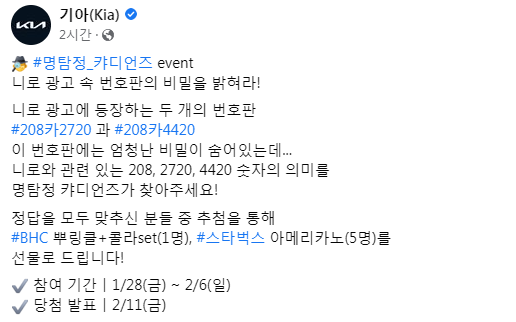 기아 명탐정 캬디언즈 이벤트 작성자야콩|작성시간22.01.28|조회수272 목록 댓글 1 글자크기 작게가 글자크기 크게가 https://www.facebook.com/kia.co.kr/posts/5262481120451120로그인 또는 가입하여 보기Facebook에서 게시물, 사진 등을 확인하세요.www.facebook.com 다음검색 현재 게시글 추가 기능 열기 북마크 공유하기 신고 센터로 신고 댓글 댓글 1 댓글쓰기 답글쓰기 댓글 리스트 작성자쿨럭쿨쿨쿠쿨걱 | 작성시간 22.01.28 감사합니다 댓글 전체보기