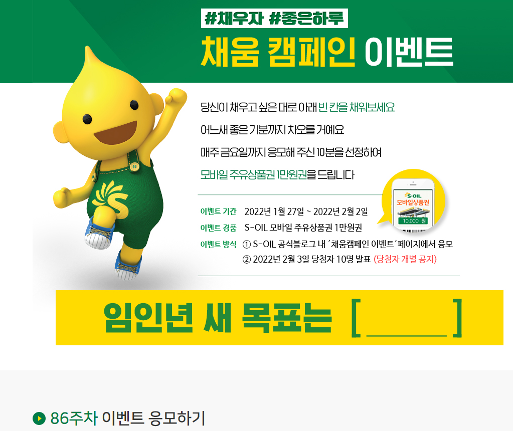 에쓰오일, 채우자 좋은하루 채움 캠페인 이벤트 (~2/2, 2/3발표) 작성자유운이|작성시간22.01.29|조회수233 목록 댓글 2 글자크기 작게가 글자크기 크게가 http://www.s-oil.com/event/2020.aspxS-oil꼭 알아두세요! 주차별 1인 1회 참여로 동일한 휴대전화번호로 중복참여가 불가능합니다. 이벤트 응모시 도용, 욕설, 비방, 악의적인 내용 또는 주체/참여방법에 맞지 않는 내용은 예고없이 삭제www.s-oil.com 다음검색 현재 게시글 추가 기능 열기 북마크 공유하기 신고 센터로 신고 댓글 댓글 2 댓글쓰기 답글쓰기 댓글 리스트 작성자star | 작성시간 22.01.29 감사합니다 작성자쿨럭쿨쿨쿠쿨걱 | 작성시간 22.01.30 감사합니다 댓글 전체보기