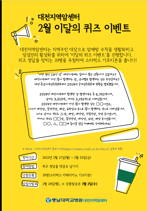 충남대학교병원 대전지역암센터, 2월 이달의 퀴즈 이벤트 (~2/25, 2/28발표) 작성자유운이|작성시간22.02.21|조회수210 목록 댓글 0 글자크기 작게가 글자크기 크게가 https://www.facebook.com/dcc0321/photos/a.332092170649651/1273845776474281/충남대학교병원 대전지역암센터 / 보건복지부 지정 대전지역 암 전문 공공의료기관 - <2022년 대<2022년 대전지역암센터 2월 이달의 퀴즈 이벤트> 안녕하십니까? 대전지역암센터입니다. 대전지역암센터는 지역주민 대상으로 암예방 수칙을 생활화하고 암검진 활성화를 위하여 '2월 이달의 퀴www.facebook.com 다음검색 현재 게시글 추가 기능 열기 북마크 공유하기 신고 센터로 신고 댓글 댓글 0 댓글쓰기 답글쓰기 댓글 리스트