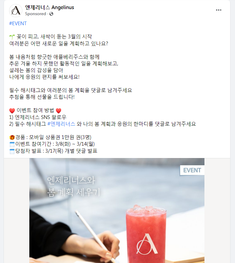 엔제리너스, 엔제리너스와 봄 계획 세우기 이벤트 (~3/14, 3/17발표) 작성자유운이|작성시간22.03.09|조회수239 목록 댓글 0 글자크기 작게가 글자크기 크게가 https://www.facebook.com/angelinustime/photos/a.285822351493240/7106885199386887/엔제리너스 Angelinus - #EVENT ⠀ 🌱 꽃이 피고, 새싹이 돋는 3월의 시작 여러분은 어떤 새로운 일을 #EVENT ⠀ 🌱 꽃이 피고, 새싹이 돋는 3월의 시작 여러분은 어떤 새로운 일을 계획하고 있나요? ⠀ 봄 내음처럼 향긋한 애플베리주스와 함께 추운 겨울 하지 못했던 활동적인 일을 계획해보고, 설www.facebook.com 다음검색 현재 게시글 추가 기능 열기 북마크 공유하기 신고 센터로 신고 댓글 댓글 0 댓글쓰기 답글쓰기 댓글 리스트