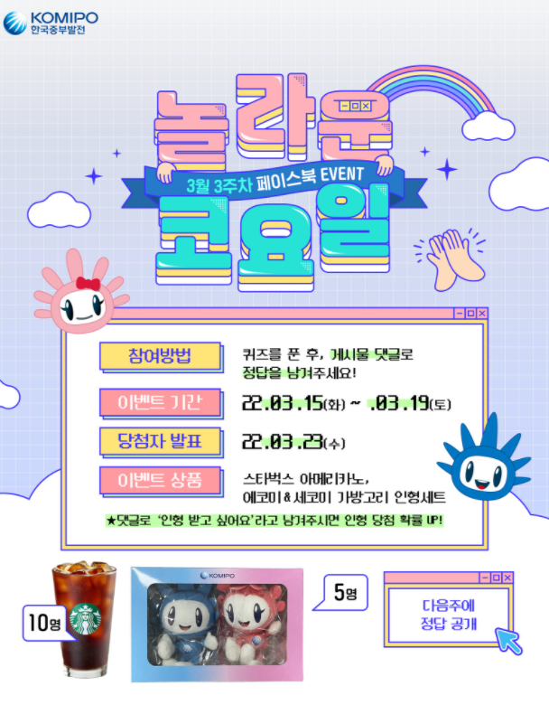 한국중부발전 3월 3주차 놀라운 코요일 이벤트 작성자야콩|작성시간22.03.15|조회수231 목록 댓글 0 글자크기 작게가 글자크기 크게가 https://www.facebook.com/komipo/posts/7226093184132513로그인 또는 가입하여 보기Facebook에서 게시물, 사진 등을 확인하세요.www.facebook.com 다음검색 현재 게시글 추가 기능 열기 북마크 공유하기 신고 센터로 신고 댓글 댓글 0 댓글쓰기 답글쓰기 댓글 리스트