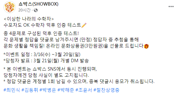 쇼박스 수학자 덕후 인증 테스트 이벤트 작성자야콩|작성시간22.03.17|조회수178 목록 댓글 0 글자크기 작게가 글자크기 크게가 https://www.facebook.com/Showbox.Movie/posts/5029168307160239로그인 또는 가입하여 보기Facebook에서 게시물, 사진 등을 확인하세요.www.facebook.com 다음검색 현재 게시글 추가 기능 열기 북마크 공유하기 신고 센터로 신고 댓글 댓글 0 댓글쓰기 답글쓰기 댓글 리스트