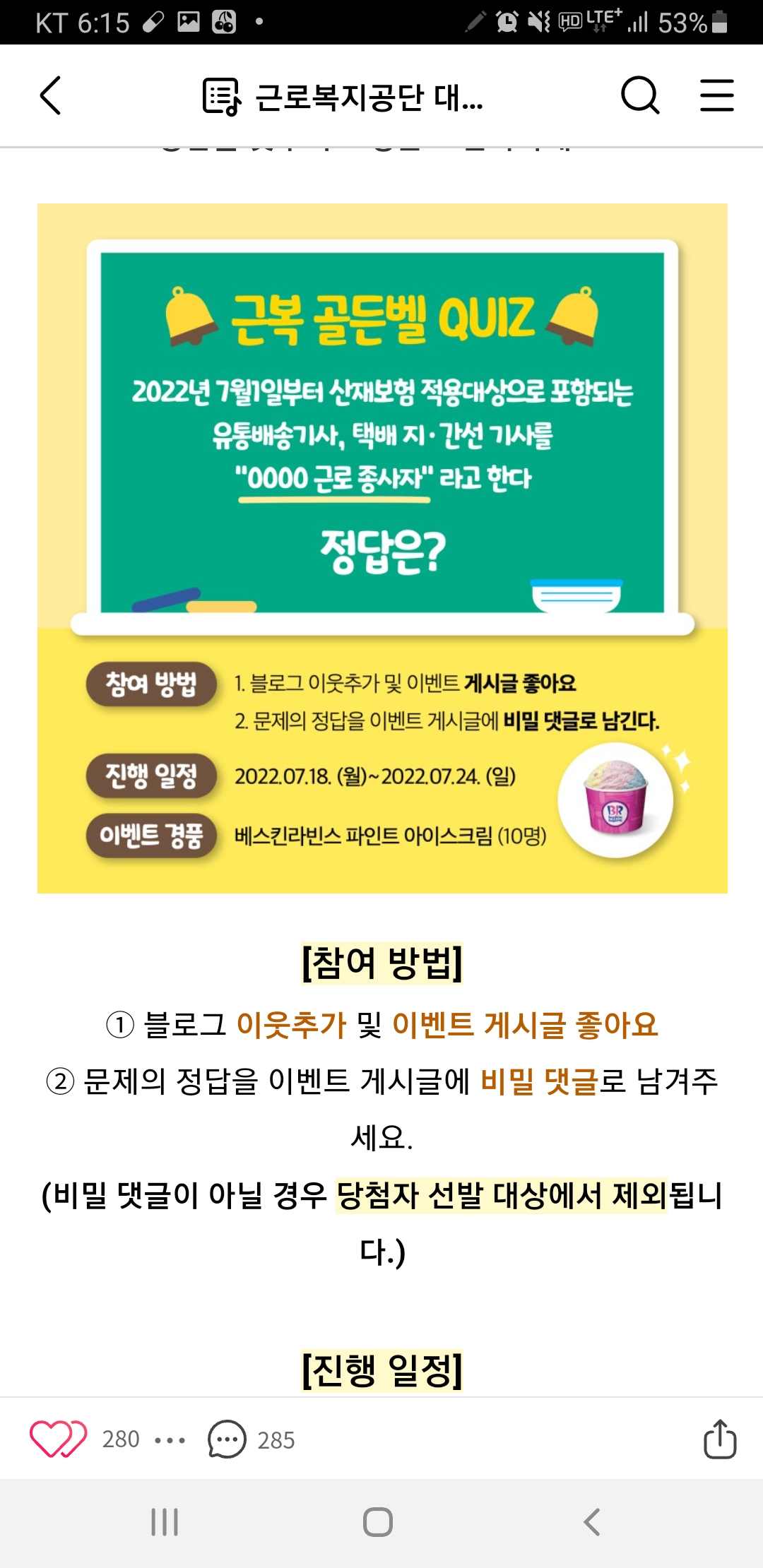 근로복지공단 근복 골든벨 퀴즈(~7.24) 작성자난이언니|작성시간22.07.19|조회수325 목록 댓글 2 글자크기 작게가 글자크기 크게가 https://m.blog.naver.com/comwel2009/222816819427 다음검색 현재 게시글 추가 기능 열기 북마크 공유하기 신고 센터로 신고 댓글 댓글 2 댓글쓰기 답글쓰기 댓글 리스트 작성자강영현 | 작성시간 22.07.19 감사합니다 작성자얼음골사과즙 | 작성시간 22.07.19 특수형태감사합니다 댓글 전체보기