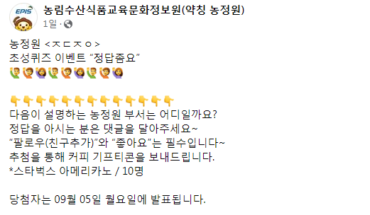 농림수산식품교육문화정보원 농정원 부서는 어디일까요? ~9.4 작성자야콩|작성시간22.08.31|조회수288 목록 댓글 0 글자크기 작게가 글자크기 크게가 https://www.facebook.com/episian/posts/pfbid02dmzHjZoEKGZWqjK2Rhc74KWe7sxTfGYXuy5TxWn8dNEGhKKD9pVSgwGzF6xwf5Dol농림수산식품교육문화정보원(약칭 농정원)농정원 <ㅈㄷㅈㅇ> 초성퀴즈 이벤트 “정답좀요” 🙋♂️🙋🙋♀️🙋♂️🙋🙋♀️🙋♂️🙋🙋♀️ ⠀ 👇👇👇👇👇👇👇👇👇👇👇👇👇 다음이 설명하는 농정원 부서www.facebook.com 다음검색 현재 게시글 추가 기능 열기 북마크 공유하기 신고 센터로 신고 댓글 댓글 0 댓글쓰기 답글쓰기 댓글 리스트