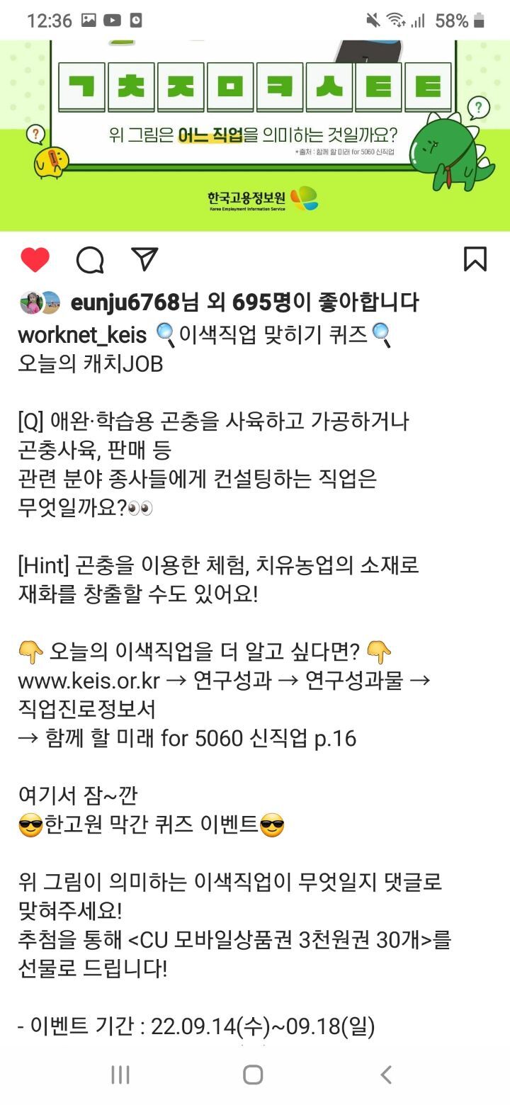 한국고용정보원 이색직업 맞히기 퀴즈 (~9.18) 작성자나도쫌|작성시간22.09.18|조회수302 목록 댓글 0 글자크기 작게가 글자크기 크게가 https://www.instagram.com/p/CieTWpWNS4S/?igshid=NDRkN2NkYzU= 다음검색 현재 게시글 추가 기능 열기 북마크 공유하기 신고 센터로 신고 댓글 댓글 0 댓글쓰기 답글쓰기 댓글 리스트