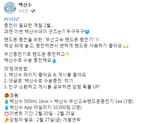 백산수 수분충전 이벤트 ~2.25 작성자야콩|작성시간23.02.20|조회수205 목록 댓글 0 글자크기 작게가 글자크기 크게가 https://www.facebook.com/baeksansoo.official/posts/pfbid08Y441jsHkQFnfkmwsSnHkQk3tnvmNLtpAf8hmgHj2QYsVjfGtK65veuPUU5BEMnLl로그인 또는 가입하여 보기Facebook에서 게시물, 사진 등을 확인하세요.www.facebook.com 다음검색 현재 게시글 추가 기능 열기 북마크 공유하기 신고 센터로 신고 댓글 댓글 0 댓글쓰기 답글쓰기 댓글 리스트