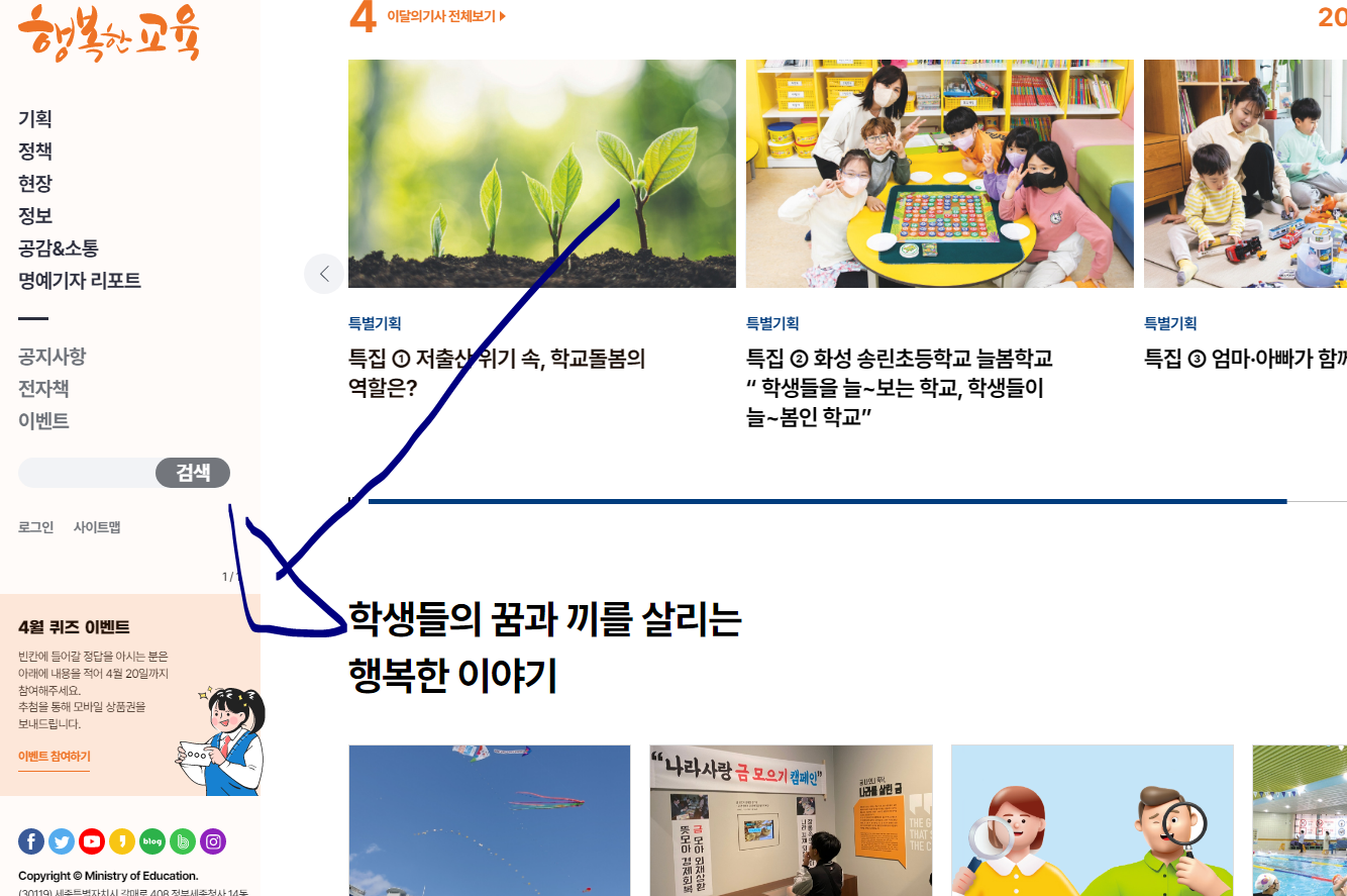 교육부 행복한교육, 4월 퀴즈 이벤트 (~4.20) 작성자유운이|작성시간23.04.03|조회수294 목록 댓글 2 글자크기 작게가 글자크기 크게가 https://happyedu.moe.go.kr/happyEduMain.do행복한교육교육부 발행 웹진, 간행물, 교육부 관련 정책, 현장, 정보, 명예기자 소개, 구독신청happyedu.moe.go.kr늘봄학교 다음검색 현재 게시글 추가 기능 열기 북마크 공유하기 신고 센터로 신고 댓글 댓글 2 댓글쓰기 답글쓰기 댓글 리스트 작성자팥빙수좋아라 | 작성시간 23.04.04 감사합니다 작성자광어 | 작성시간 23.04.07 정보 감사합니다. 댓글 전체보기