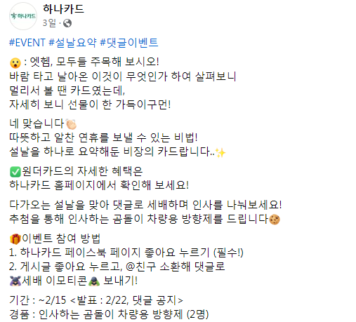 하나카드 세배 이벤트 ~2.15 작성자야콩|작성시간24.02.11|조회수129 목록 댓글 0 글자크기 작게가 글자크기 크게가 https://www.facebook.com/hanacard/posts/pfbid02rry8M4WGHFR47VfZ3YNHV92jX3QgosHNgRJhaEn8PqYMZBjbWmr52PSs4LWzVcWcl하나카드#EVENT #설날요약 #댓글이벤트 😮 : 엣헴, 모두들 주목해 보시오! 바람 타고 날아온 이것이 무엇인가 하여 살펴보니 멀리서 볼 땐 카드였는데, 자세히 보니 선물이 한 가득이구먼! 네 맞습니다👏www.facebook.com 다음검색 현재 게시글 추가 기능 열기 북마크 공유하기 신고 센터로 신고 댓글 댓글 0 댓글쓰기 답글쓰기 댓글 리스트
