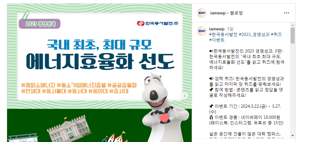 한국동서발전, 2023 경영성과 이벤트 (~3.27) 작성자유운이|작성시간24.03.26|조회수115 목록 댓글 0 글자크기 작게가 글자크기 크게가 https://www.instagram.com/p/C4zx1b5KkZz/?img_index=1 다음검색 현재 게시글 추가 기능 열기 북마크 공유하기 신고 센터로 신고 댓글 댓글 0 댓글쓰기 답글쓰기 댓글 리스트