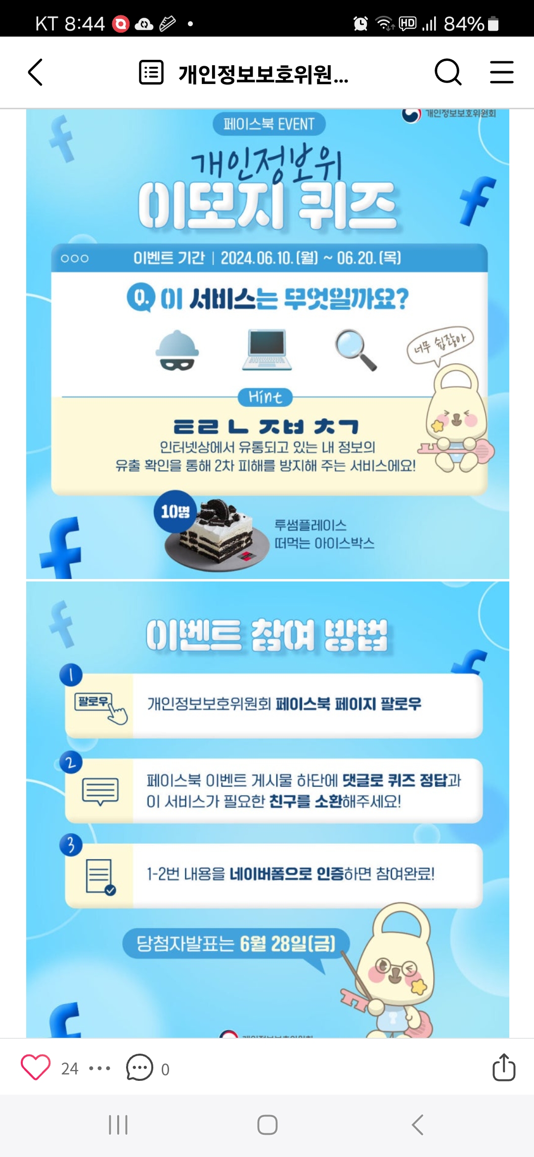 개인정보보호위원회 이모지 퀴즈이벤트 (~6.20) 작성자난이언니|작성시간24.06.11|조회수111 목록 댓글 0 글자크기 작게가 글자크기 크게가 https://m.blog.naver.com/pipcpr/223474766454 다음검색 현재 게시글 추가 기능 열기 북마크 공유하기 신고 센터로 신고 댓글 댓글 0 댓글쓰기 답글쓰기 댓글 리스트
