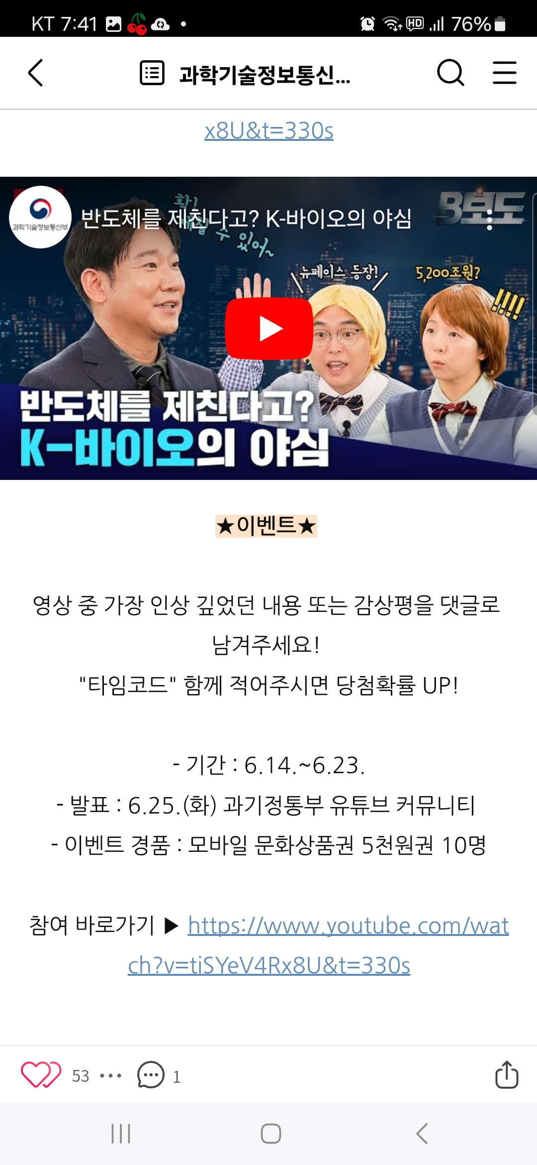 과학기술정보통신부 감상평을 남겨주세요(~6.23) 작성자난이언니|작성시간24.06.15|조회수105 목록 댓글 0 글자크기 작게가 글자크기 크게가 https://m.blog.naver.com/with_msip/223479504678 다음검색 현재 게시글 추가 기능 열기 북마크 공유하기 신고 센터로 신고 댓글 댓글 0 댓글쓰기 답글쓰기 댓글 리스트