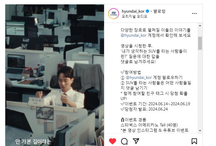 현대자동차, 내가 생각하는 SUV를 타는 사람들이란? (~6.19) 작성자유운이|작성시간24.06.18|조회수125 목록 댓글 0 글자크기 작게가 글자크기 크게가 https://www.instagram.com/reel/C8LbdKsChzO/?hl=ko 다음검색 현재 게시글 추가 기능 열기 북마크 공유하기 신고 센터로 신고 댓글 댓글 0 댓글쓰기 답글쓰기 댓글 리스트