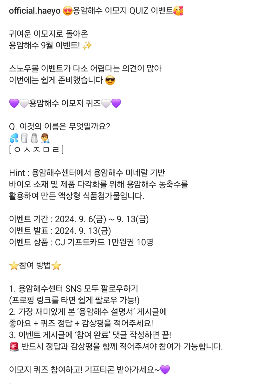 용암해수센터 이모지 퀴즈 이벤트 (~9.13) 작성자난이언니|작성시간24.09.08|조회수128 목록 댓글 0 글자크기 작게가 글자크기 크게가 https://www.instagram.com/p/C_jxH4Yue0F/?igsh=eWZvN2ZlMnk4d3Bh 다음검색 현재 게시글 추가 기능 열기 북마크 공유하기 신고 센터로 신고 댓글 댓글 0 댓글쓰기 답글쓰기 댓글 리스트
