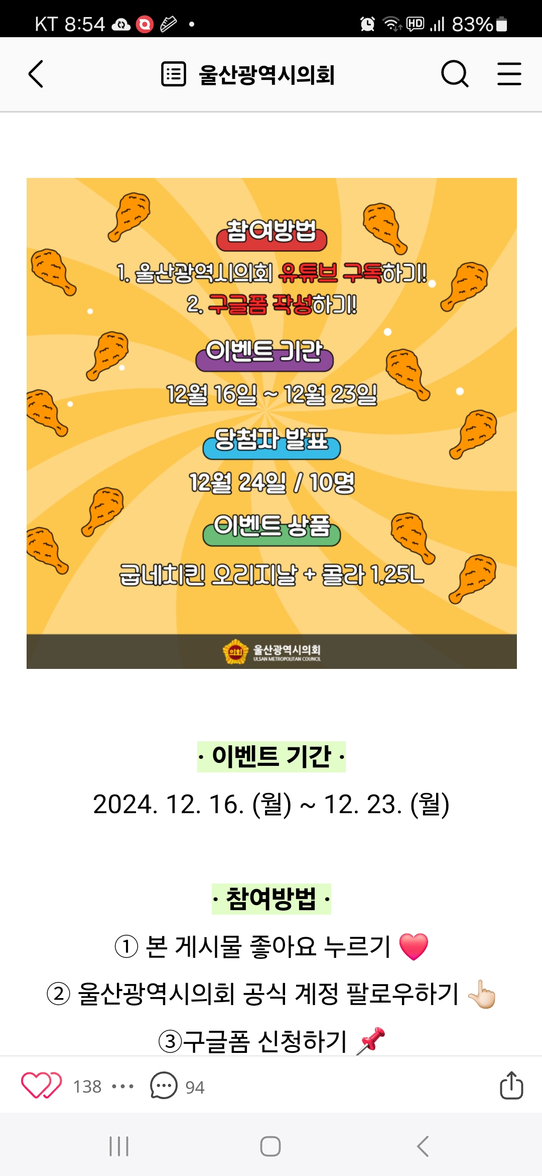 울산광역시의회 유튜브 구독이벤트(~12.23) 작성자난이언니|작성시간24.12.17|조회수94 목록 댓글 0 글자크기 작게가 글자크기 크게가 https://m.blog.naver.com/councilulsan/223695387910 다음검색 현재 게시글 추가 기능 열기 북마크 공유하기 신고 센터로 신고 댓글 댓글 0 댓글쓰기 답글쓰기 댓글 리스트