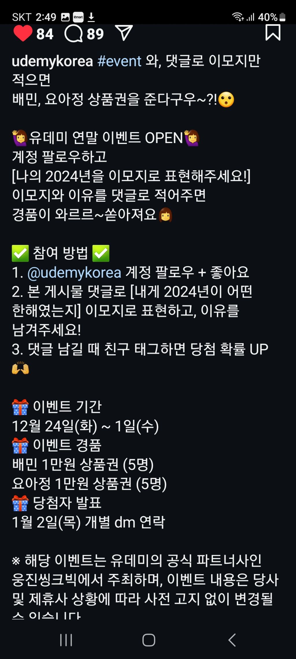 유데미코리아 이모지 이벤트 (~1.1) 작성자나도쫌|작성시간24.12.25|조회수103 목록 댓글 0 글자크기 작게가 글자크기 크게가 https://www.instagram.com/p/DD8Y09KCSQH/?igsh=MWN5MXZoM2pobmgxag== 다음검색 현재 게시글 추가 기능 열기 북마크 공유하기 신고 센터로 신고 댓글 댓글 0 댓글쓰기 답글쓰기 댓글 리스트