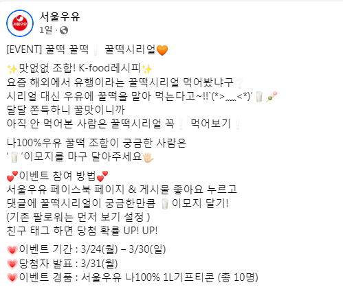 서울우유 이모지 이벤트 ~3.30 작성자야콩|작성시간25.03.25|조회수94 목록 댓글 0 글자크기 작게가 글자크기 크게가 https://www.facebook.com/SeoulMilk/videos/1386164545730160/로그인 또는 가입하여 보기Facebook에서 게시물, 사진 등을 확인하세요.www.facebook.com 다음검색 현재 게시글 추가 기능 열기 북마크 공유하기 신고 센터로 신고 댓글 댓글 0 댓글쓰기 답글쓰기 댓글 리스트