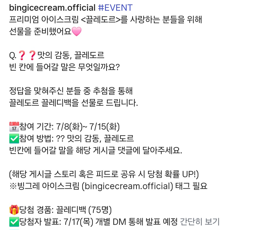 빙그레 아이스크림 끌레도르 굿즈 증정 이벤트 (~7.15) 작성자난이언니|작성시간25.07.10|조회수100 목록 댓글 1 글자크기 작게가 글자크기 크게가 https://www.instagram.com/p/DL1t6U0RE11/?igsh=ZXN1cDVwMnkwOWNm 다음검색 현재 게시글 추가 기능 열기 북마크 공유하기 신고 센터로 신고 댓글 댓글 1 댓글쓰기 답글쓰기 댓글 리스트 작성자뽀롱이1 | 작성시간 25.07.15 감사합니다 댓글 전체보기