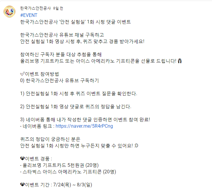 한국가스안전공사 '안전 실험실' 1화 시청 댓글 이벤트 ~8.3 작성자야콩|작성시간25.08.02|조회수89 목록 댓글 0 글자크기 작게가 글자크기 크게가 https://www.youtube.com/post/UgkxRmvFfgUiKcomr1N889Vtn4_2hcar-ewh한국가스안전공사님의 게시물#EVENT 한국가스안전공사 '안전 실험실' 1화 시청 댓글 이벤트 ⠀ 한국가스안전공사 유튜브 채널 구독하고 안전 실험실 1화 영상 시청 후, 퀴즈 맞추고 경품 받아가세요! ⠀ 참여하신 구독자 분들 www.youtube.com 다음검색 현재 게시글 추가 기능 열기 북마크 공유하기 신고 센터로 신고 댓글 댓글 0 댓글쓰기 답글쓰기 댓글 리스트