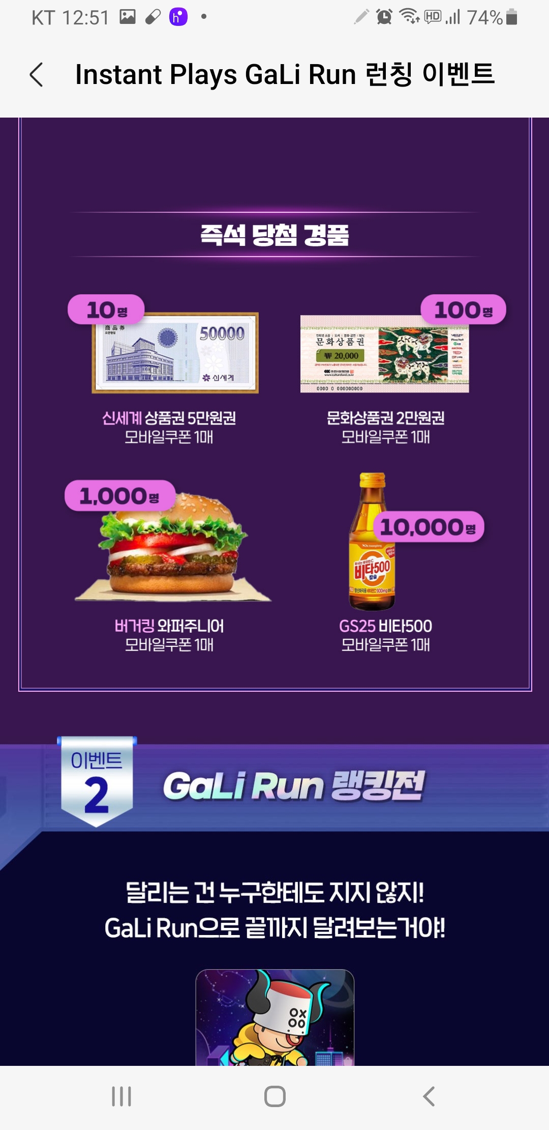 갤럭시스토어앱 GaLi Run 런칭 이벤트 (~9.18) 작성자난이언니|작성시간22.09.07|조회수4,524 목록 댓글 3 글자크기 작게가 글자크기 크게가 다음검색 현재 게시글 추가 기능 열기 북마크 공유하기 신고 센터로 신고 댓글 댓글 3 댓글쓰기 답글쓰기 댓글 리스트 작성자star | 작성시간 22.09.07 두번째 게임이 너무 어렵네요 포기ㅠ 작성자화려한유혹 | 작성시간 22.09.07 겨우 성공했는데 꽝! 답댓글 작성자star | 작성시간 22.09.07 고생했어요 댓글 전체보기