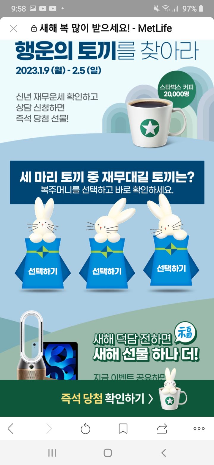 메트라이프 행운의 토끼를 찾아라(~2.5) 작성자나도쫌|작성시간23.01.10|조회수635 목록 댓글 4 글자크기 작게가 글자크기 크게가 새해 복 많이 받으세요!메트라이프에서 준비한 새해 선물도 확인해 보세요.www.emetlife.kr 다음검색 현재 게시글 추가 기능 열기 북마크 공유하기 신고 센터로 신고 댓글 댓글 4 댓글쓰기 답글쓰기 댓글 리스트 작성자star | 작성시간 23.01.10 2만명인데 꽝이네요ㅠㅠ 작성자포발리코 | 작성시간 23.01.10 힘내세요 작성자뻐찌지 | 작성시간 23.01.10 아쉽지만 저도 꽝 작성자다주세요~~네! | 작성시간 23.01.10 감사합니다. 꽝이네요~^^ 댓글 전체보기