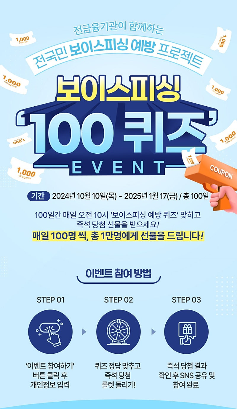 전국민 보이스피싱 예방 프로젝트 (~1.17) 작성자나도쫌|작성시간24.10.12|조회수1,370 목록 댓글 2 글자크기 작게가 글자크기 크게가 전국민 보이스피싱 예방 프로젝트보이스피싱 '100퀴즈' 이벤트voice100event.com하루 20회 다음검색 현재 게시글 추가 기능 열기 북마크 공유하기 신고 센터로 신고 댓글 댓글 2 댓글쓰기 답글쓰기 댓글 리스트 작성자알뜰아줌 | 작성시간 24.10.13 감사합니다. 작성자star | 작성시간 24.12.13 중노동ㅠㅠ 댓글 전체보기