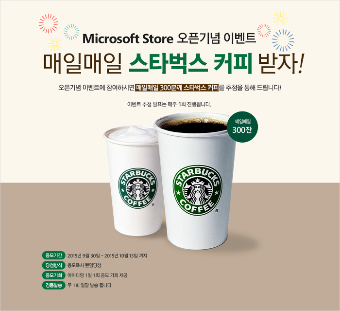 [매일응모]옥션, Microsoft Store 오픈기념 이벤트 - 매일 300명 스타벅스 커피 즉당(9/30~10/13)