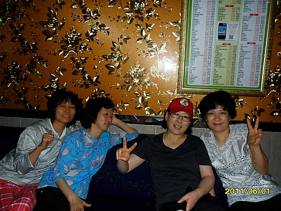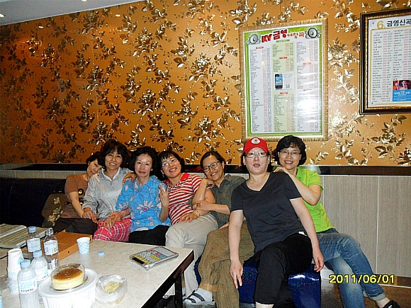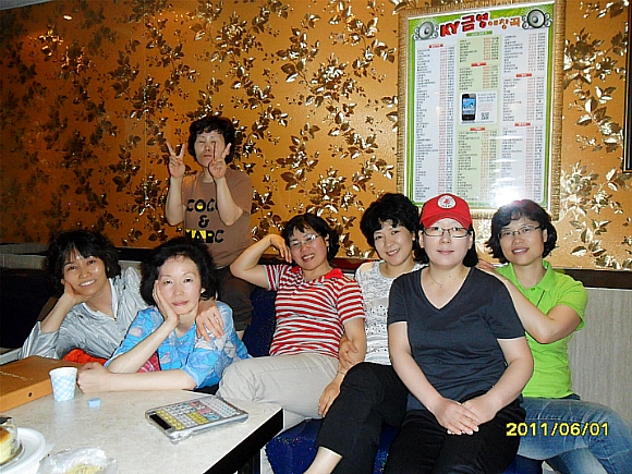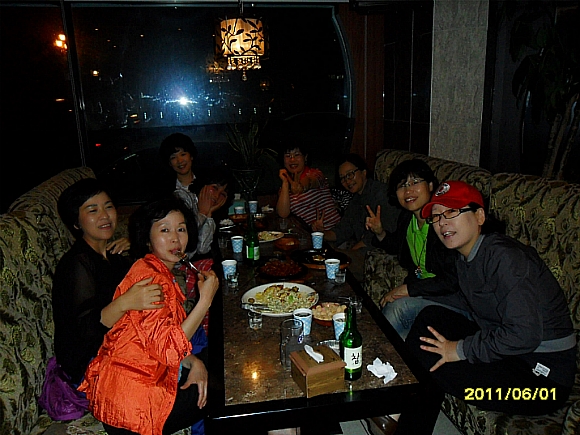 못 나오신 분들 힘드시겠지만 번개 맞은 우리 얼굴 봐 주십시오. 저기 푸른 병들과 맥시칸 샐러드, 닭발 구이, 매운 닭 바베큐, 계란 구이가 넘실대는 식탁 좀 보세여~ 미환 언니가 구지뽕 냉차까지 갖고 오셔서 알콜은 적당적당 희석해가면서 드셨다는~ "비카" 사모님이 잘 찍어 주셨네요. 와!! 노래 잘하는것도 죄가? 영희님 목소리는 언제 들어도 폭포처럼 시원~ 두 분은 가셨어요~ 푸른 병 속으로 가셨어요~ 노래하다가도 이쁜짓~ 하면 금방 요렇게 구여워지는 우리 님들, 적당히 나른하고 적당히 무안하고 적당히 기분좋은 번개 맞던 지난 밤!!!