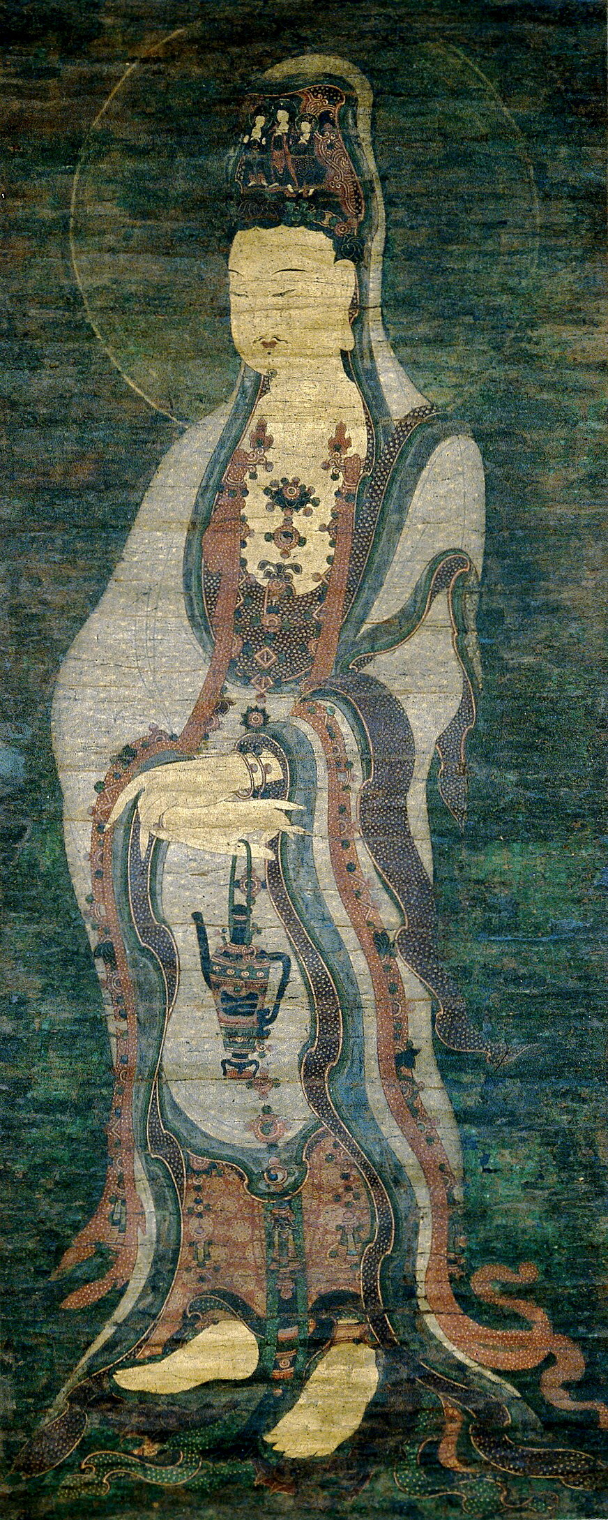 고려불화 중에서 격이 좀 떨어지는 작품입니다. 총 10등급 중 7~9 등급 정도 되는 작품입니다. 돈을 별로 들이지 않고 제작한 작품이라고 말할 수 있습니다. 색감도 별로이고, 염료도 석채가 아닌 것이 섞인 듯 합니다. 전체 장식 문양도 떨어지고, 손에 든 감로수병의 위치도 최적의 것이 아니며, 감로수병이 마치 어설픈 짝퉁 감로수병인 듯이 보이고, 왼발이 부자연스럽습니다. 그나마 상호, 즉 얼굴분위기는 봐줄만합니다.
