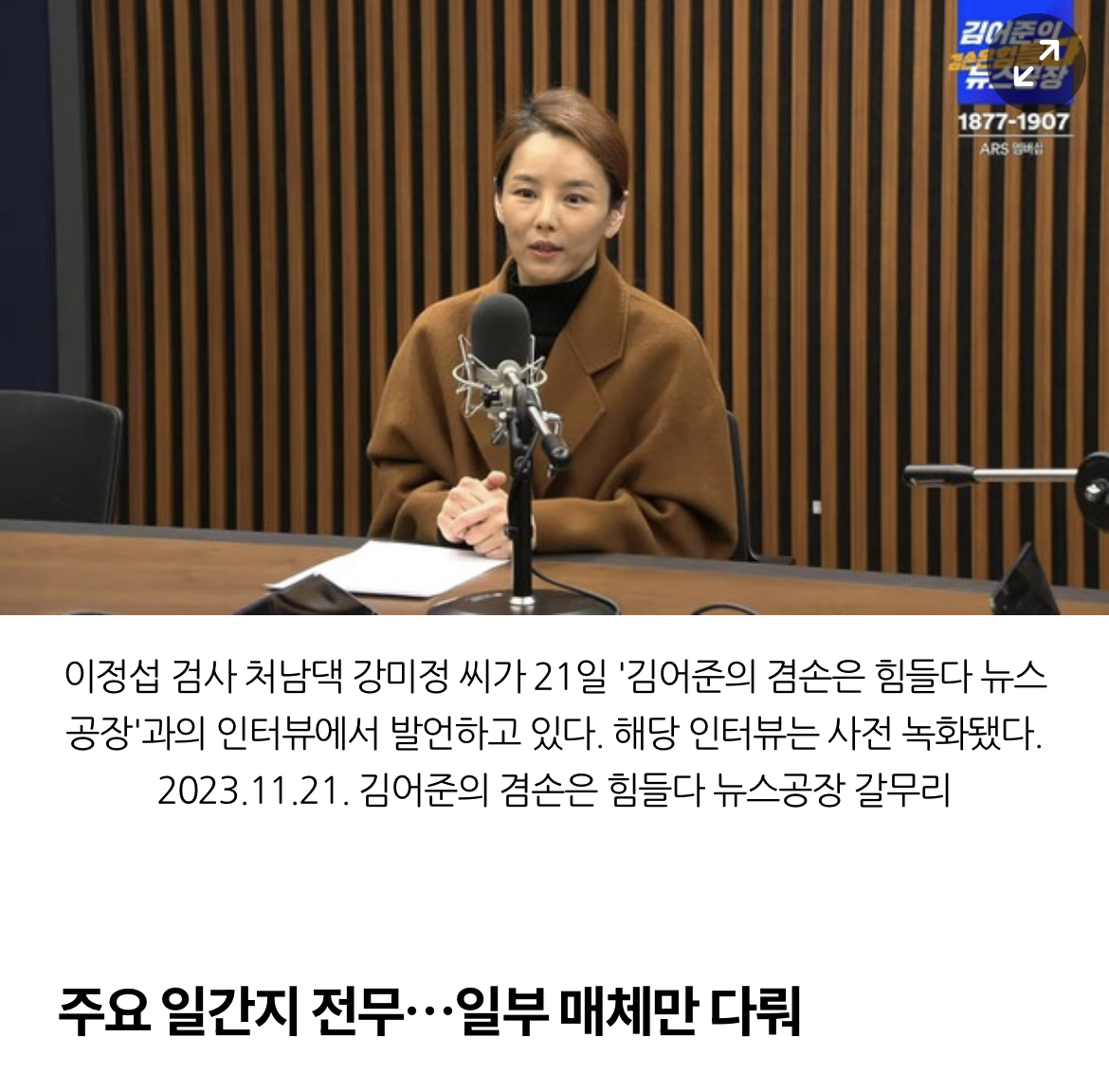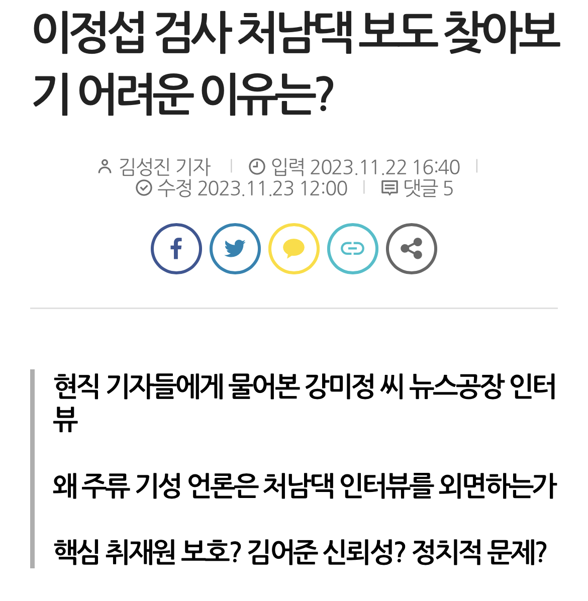 주요 일간지 중에서는 <한겨레>만 유일하게 당일 인터넷판으로 다뤘으나, 포털 뉴스 제목('이정섭 탄핵=이재명 방탄'이라던 검찰의 돌변…공수처 "지켜보겠다")으로는 강 씨의 인터뷰라고 알아보기 어려웠다.