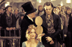 이런 식으로 스코시즈의 영화 속에는 언제나 패배에 대한 자의식과 자기 조롱이 섞여 있다. 이 영화는 그것을 마지막에 배치하여 역전의 시너지를 가지려는 것처럼 보인다(이 점은 때로 <카지노>에서처럼 죽음의 결과에서 거슬러올라가는 플래시백의 형식으로도 나타난다). 다 같이 바보가 되어보는 게임을 해보는 것이다. 하지만 마지막의 이 해프닝만이 <갱스 오브 뉴욕>의 모든 것은 아니다. 전략적으로 기술된 역사적 아이러니의 귀결에도 불구하고 <갱스 오브 뉴욕>은 첫 장면의 전투신에서 보여준 폭력적인 피의 신들림을 도저히 떨쳐버릴 수 없게 한다. 마지막 싱거운 전투가 아무리 엄숙하게 첫 장면의 이미지를 잊어버리도록 교육을 해도, 그 잔상은 쉽게 잊혀지지 않는다. 관객을 영화적인 엑스터시로 끌고 들어가는 것으로 치자면 스코시즈만한 감독이 또 누가 있을 것인가? 그러나 그의 주술에 걸려 끌려가다 어느 순간 갑자기 정신을 차려보면 언제나 무언가 남는 비참함이 있다. 항상 무언가가 물려 있다.