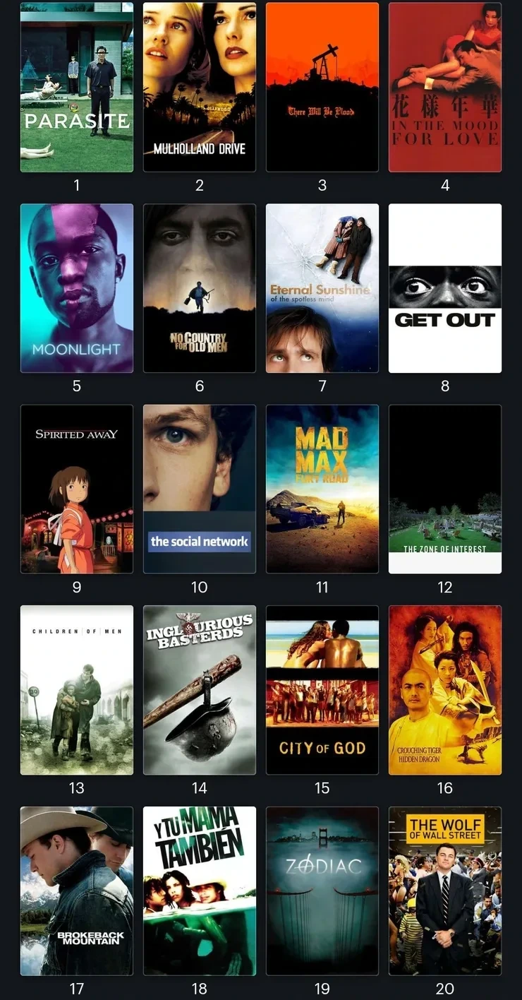 500명이 넘는 영화 제작자, 스타, 영향력있는 영화 팬을 대상으로 2000년 1월 1일 이후에 개봉된 영화 중 최고의 영화 10편(각자 나름의 기준으로 정의내린)을 투표로 뽑습니다. 투표자 중에는 페드로 알모도바르, 소피아 코폴라, 배리 젠킨스, 기예르모 델 토로 등 오스카 수상 감독들과 치웨텔 에지오포, 마이키 매디슨, 존 터투로, 줄리앤 무어 등 유명 배우들도 참여했습니다.