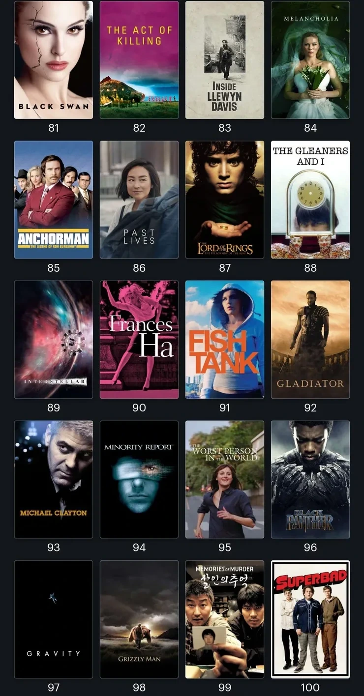 위의 리스트는 20만명 이상의 뉴욕타임스 구독자 대상으로 투표한 결과입니다(한 사람당 10편의 영화선정).