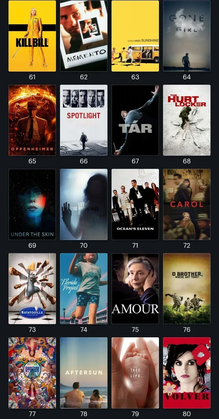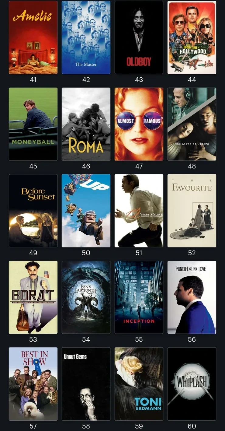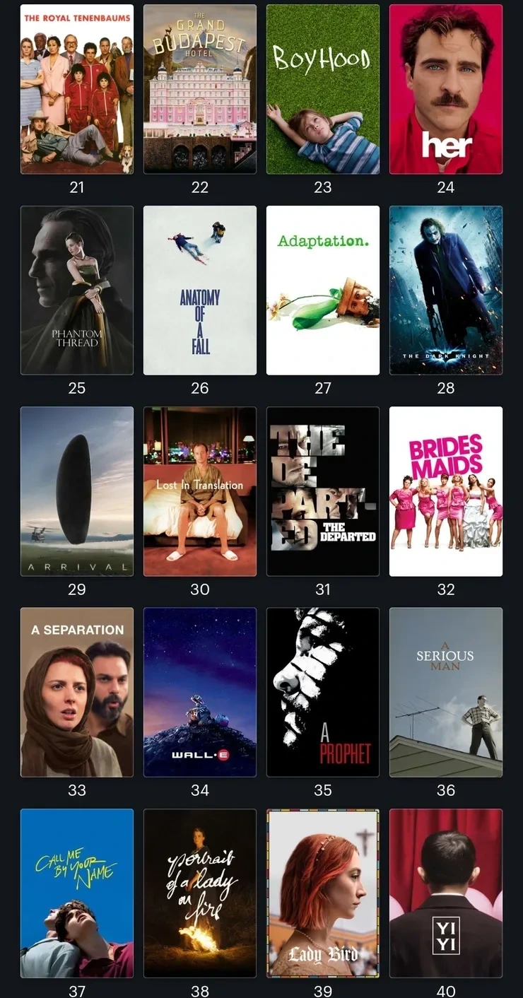 드라이브 마이 카, 로마, 매드맥스, 멀홀랜드 드라이브, 애프터썬, 에브리씽 에브리웨어 올 앳 원스, 월-E, 인셉션, 위플래쉬, 화양연화 (순위순이 아닌 제목 가나다순)
