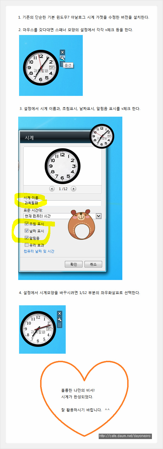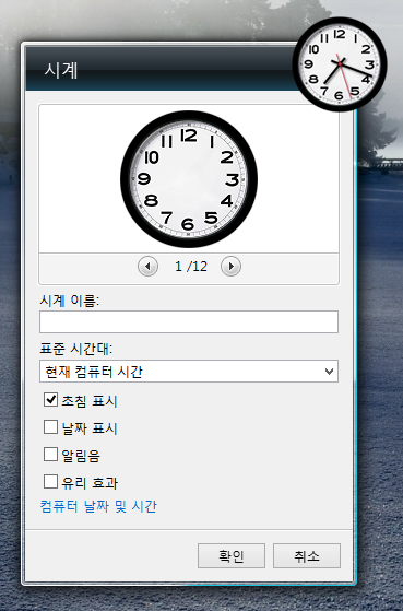 기존 윈도우7 아날로그 시게에 정각알림음과 이름도 넣을 수 있습니다.