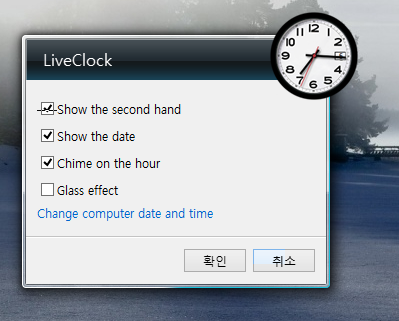 이 아날로그 시계 가젯은 단순한 기본 윈도우7 아날로그 시계 가젯을 수정한 버전인데요, 날짜 표시, 글래스 효과 외에 특별히 정각 알림 기능이 들어간 가젯입니다.