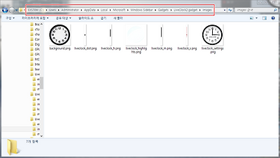 두 가지 가젯을 모두 설치했을 경우 탐색기에서 [c\users\사용자\AppData\Local\Microsoft\Windows Sidebar\Gadgets] 경로에 설치 폴더가 생기는데 첫번째 가젯의 이미지 폴더의 마음에 드는 스킨을 두번째 가젯의 이미지 폴더에 복사해서 덮어 씌우면 되네요. dot 이미지파일을 liveclock_dot 이미지 파일에 덮어씌우는 식으로 모든 이미지 파일 교체. 파일 이름은 원래 이름 그대로 두셔야 합니다.